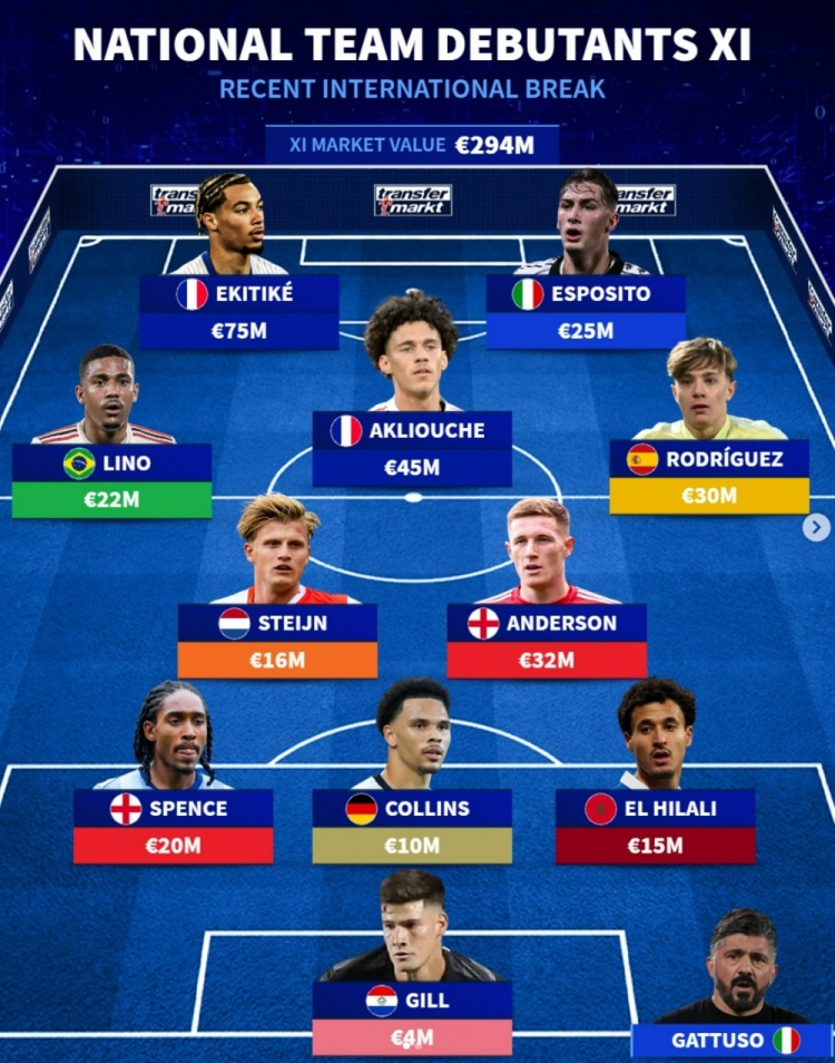 9月10日讯 德转盘点了在本次国际比赛日迎来自己国家队首秀的11人阵容,其中埃基蒂克领衔,以下为具体阵容: