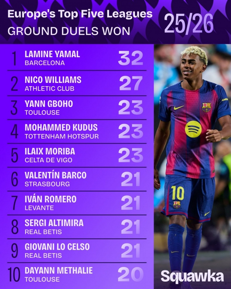 本赛季五大联赛地面对抗成功榜:亚马尔32次居首,尼科27次第二
